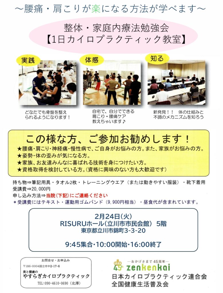 一日カイロプラクティック教室の詳細は下記のURLをクリックしてくださいね☺