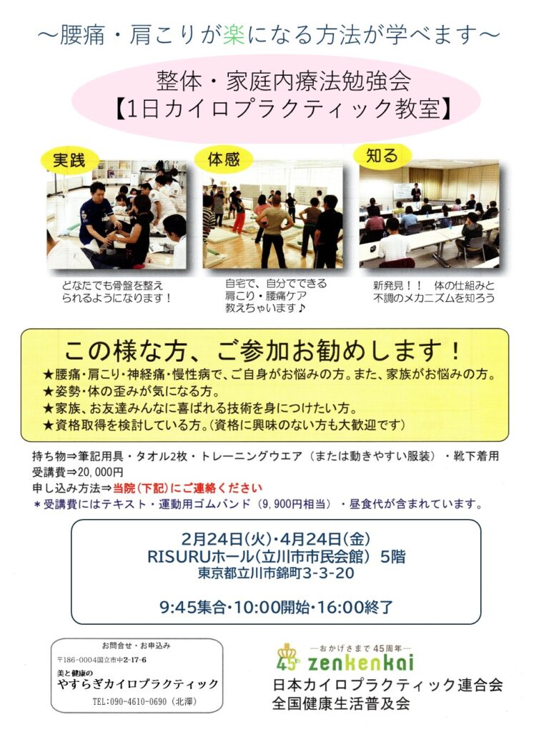 一日カイロプラクティック教室の詳細は下記のURLをクリックしてくださいね☺