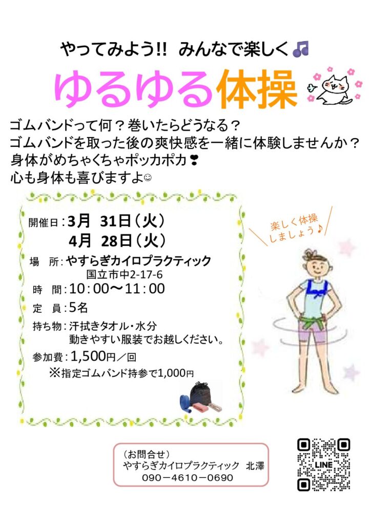 3月・4月ゆるゆる体操のご案内 投稿日 2026年2月22日 著者 美と健康のやすらぎカイロプラティック カテゴリー お知らせ ゆるゆる体操では、ゴムバンドを使って簡単な体操をしていきます。また、健康な身体を維持するために必要な知識や体験も入れていきます。お気軽にご参加お待ちしています☺ この記事を書いた人 美と健康のやすらぎカイロプラティック 記事一覧