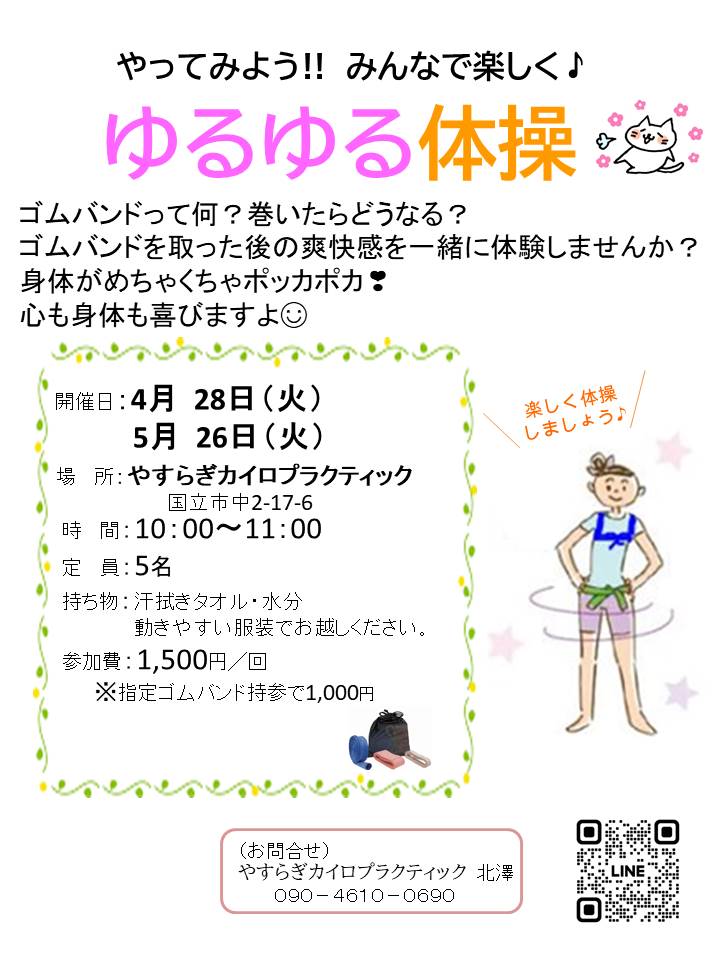 4月・5月ゆるゆる体操のご案内 投稿日 2026年3月27日 著者 美と健康のやすらぎカイロプラティック カテゴリー お知らせ ゆるゆる体操では、ゴムバンドを使って簡単な体操をしていきます。また、健康な身体を維持するために必要な知識や体験も入れていきます。お気軽にご参加お待ちしています☺ この記事を書いた人 美と健康のやすらぎカイロプラティック 記事一覧